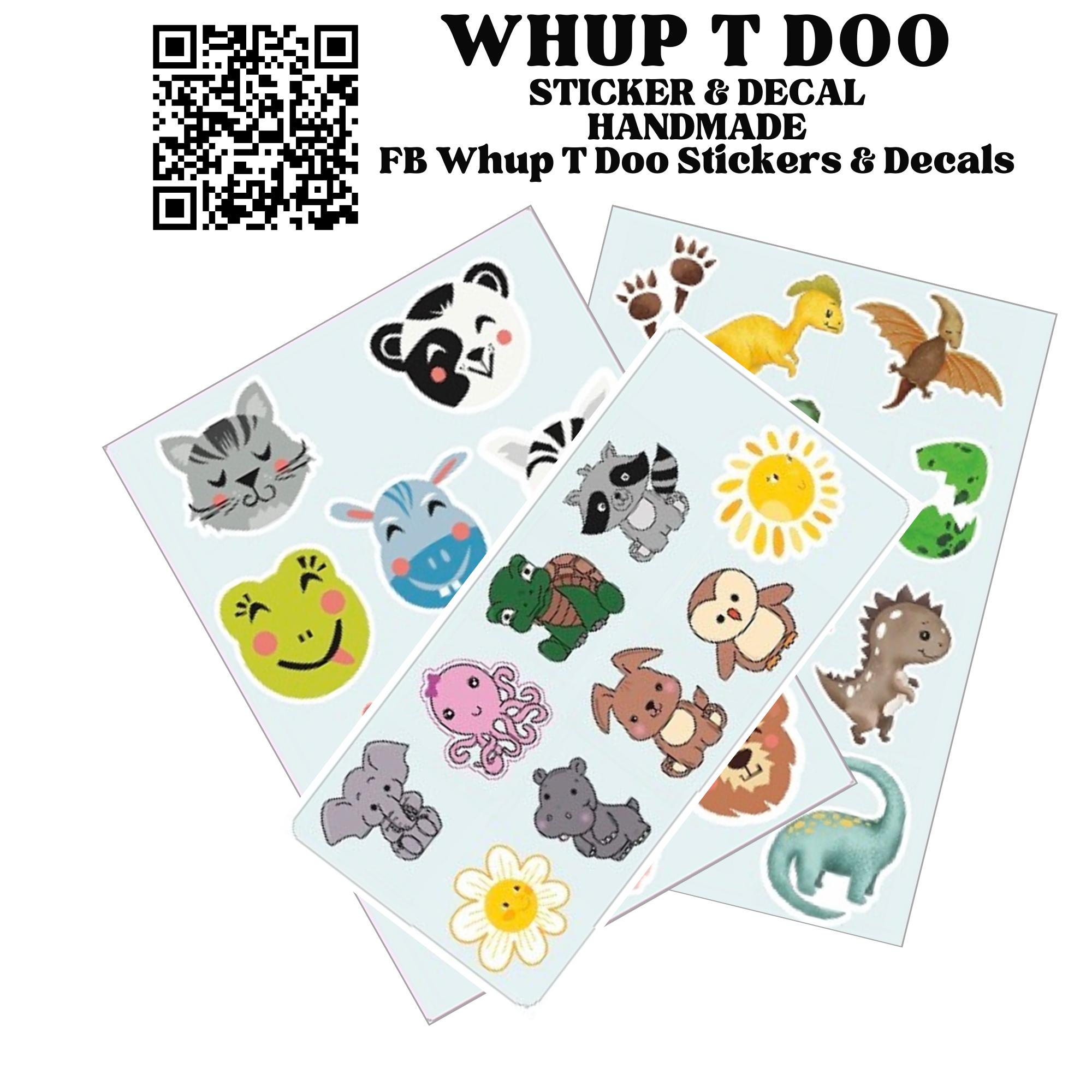 Kids sticker sheet . Cute Dinosaur sheet. Happy animal faces sheet. Baby animals sheet. The stickers are approximately 1.2 inches a total of 31 stickers . Place these stickers on cups/tumblers/water bottles, notebooks, journals , scrapbooks or any thing to decorate. I can also custom a sticker sheet. If you want the same sheet for all 3 that is an option . Send me a message with any requests