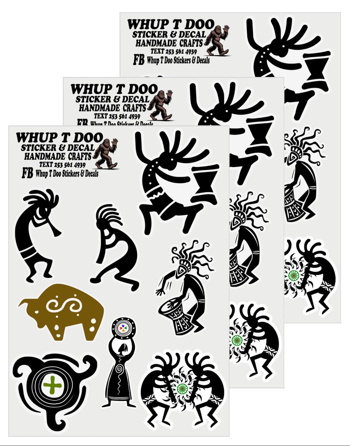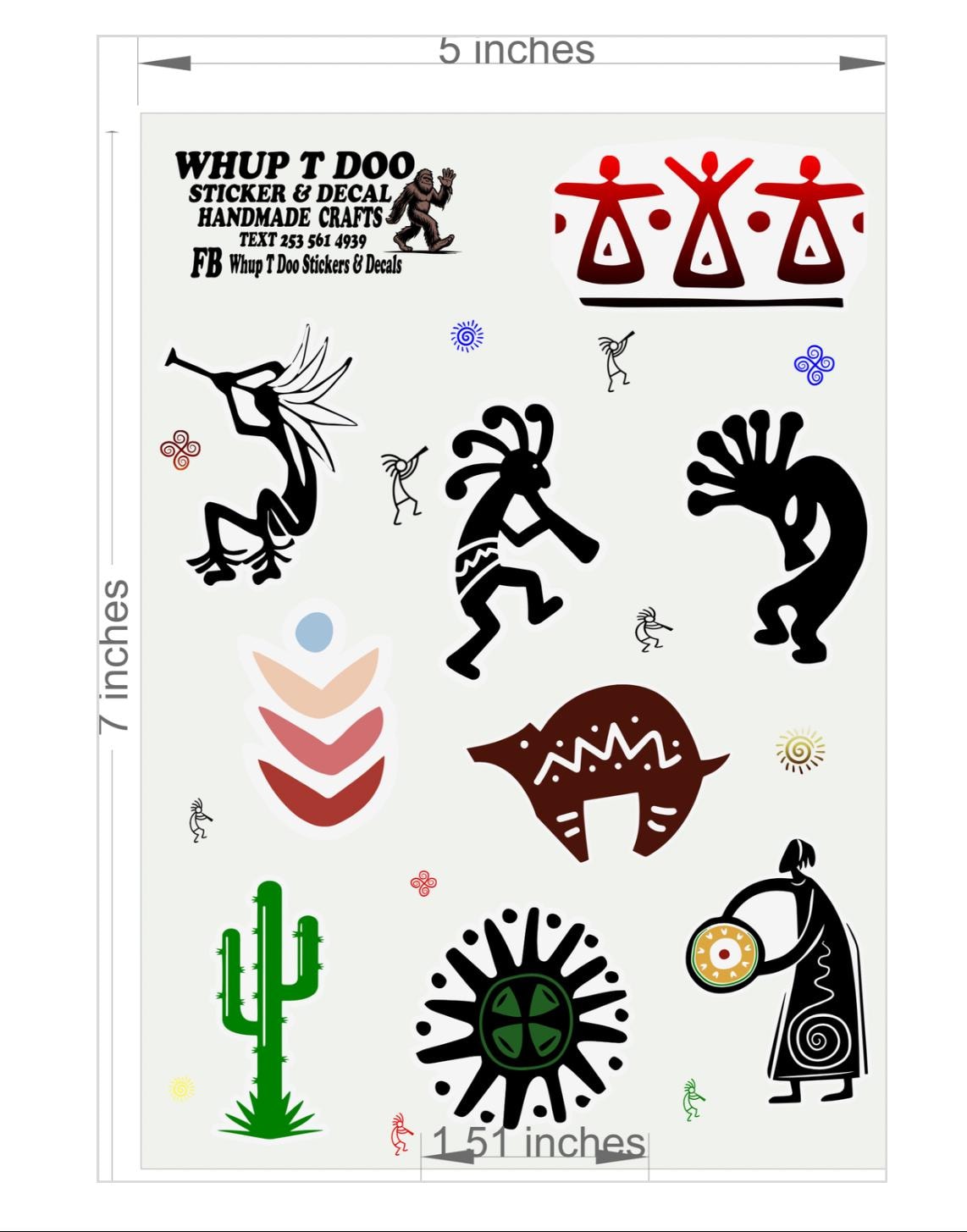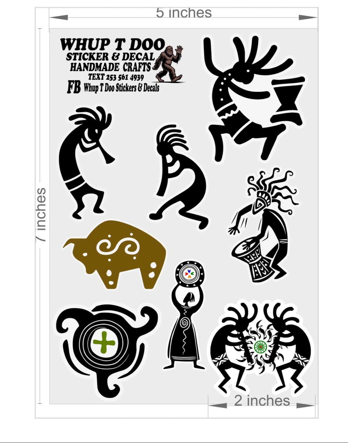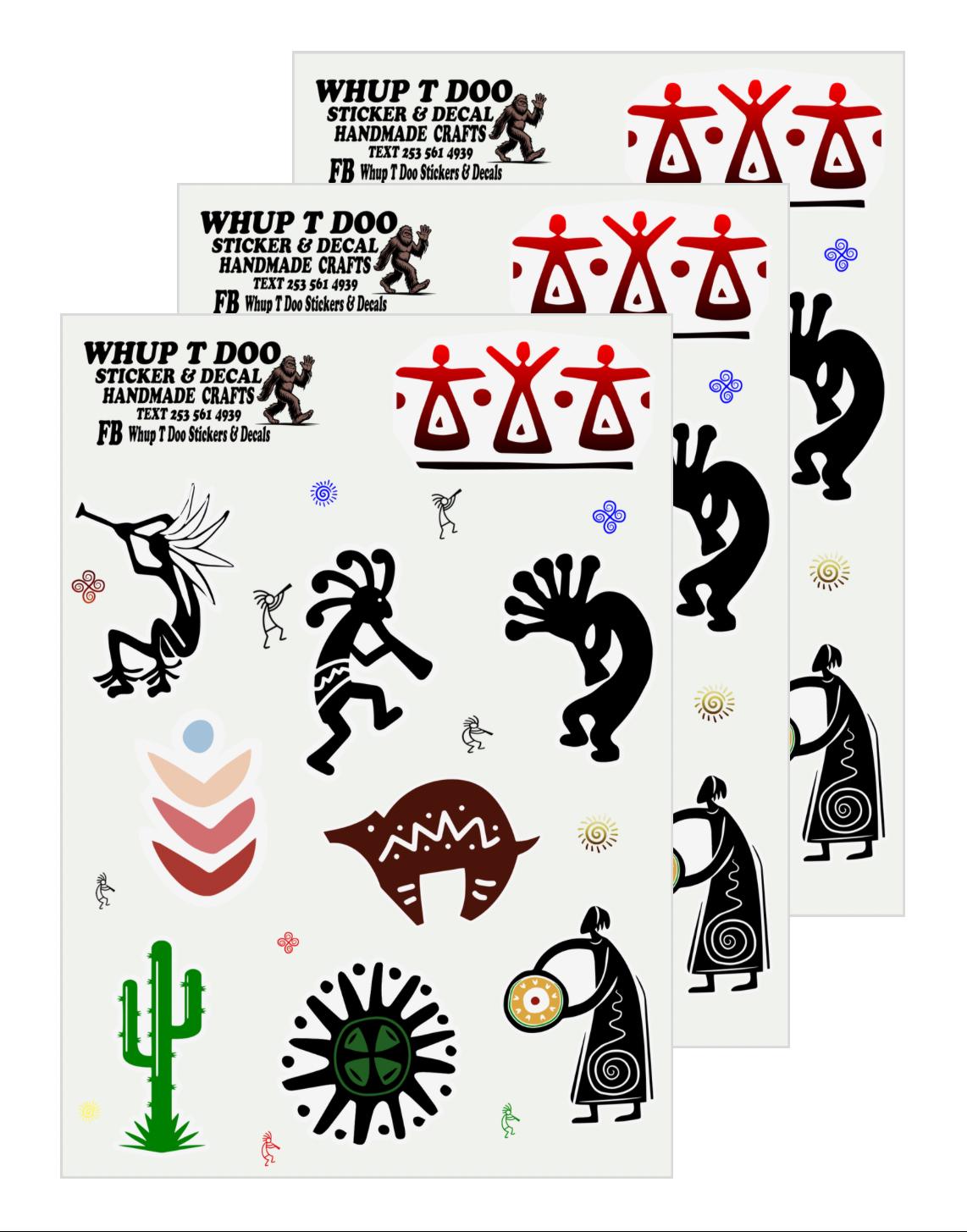 Kokopelli stickers, show your pride for Native American Heritage with these high quality sheet packs There is 4 variety to choose from Each sheet is approx 5 x 7 and stickers range from 1.2 to 2 inches and they have 7-10 stickers each.Bring these authentic art stickers to decorate cards, envelops or put on objects like water bottles, tumblers, yeti,mugs, laptop, tablets, kindles, journals, notebooks, planners, mirrors, windows, cars, bikes, golf carts, skateboards, scrapbooks or anything , notebooks, journals and use for scrapbooks, put on laptops, mirrors and windows or anything!!