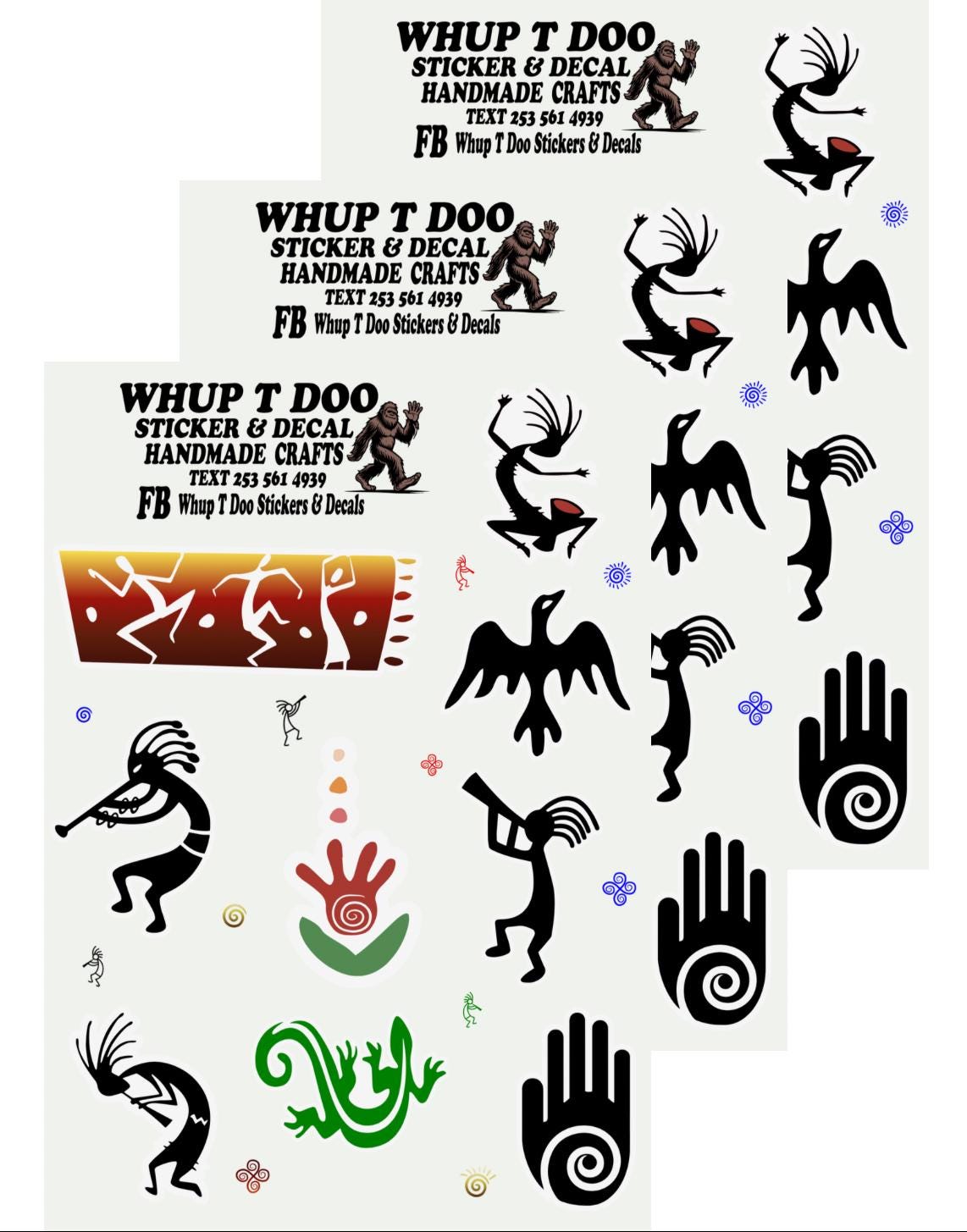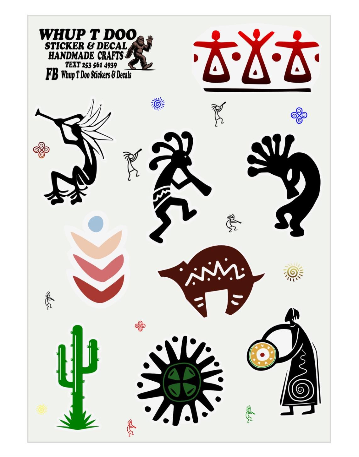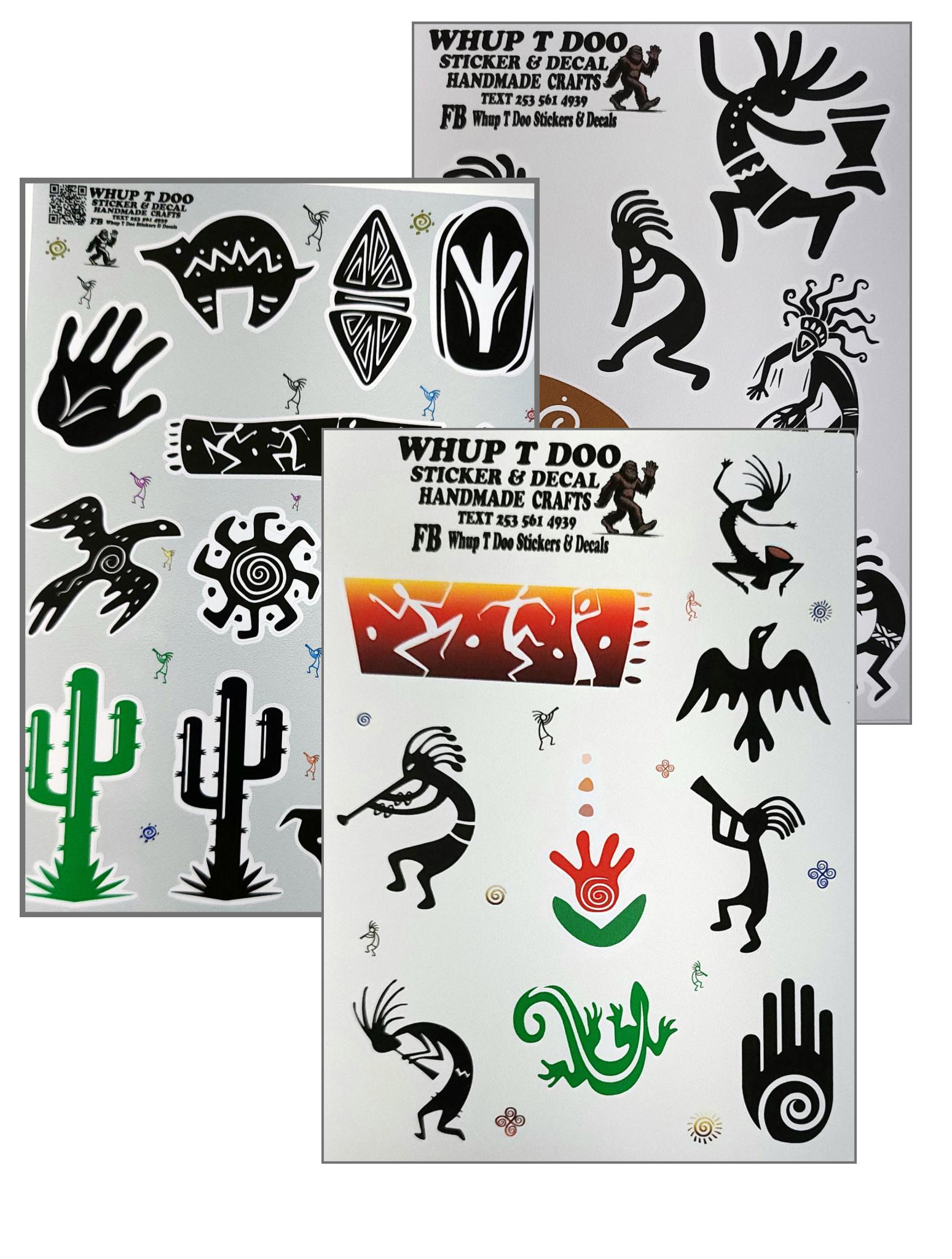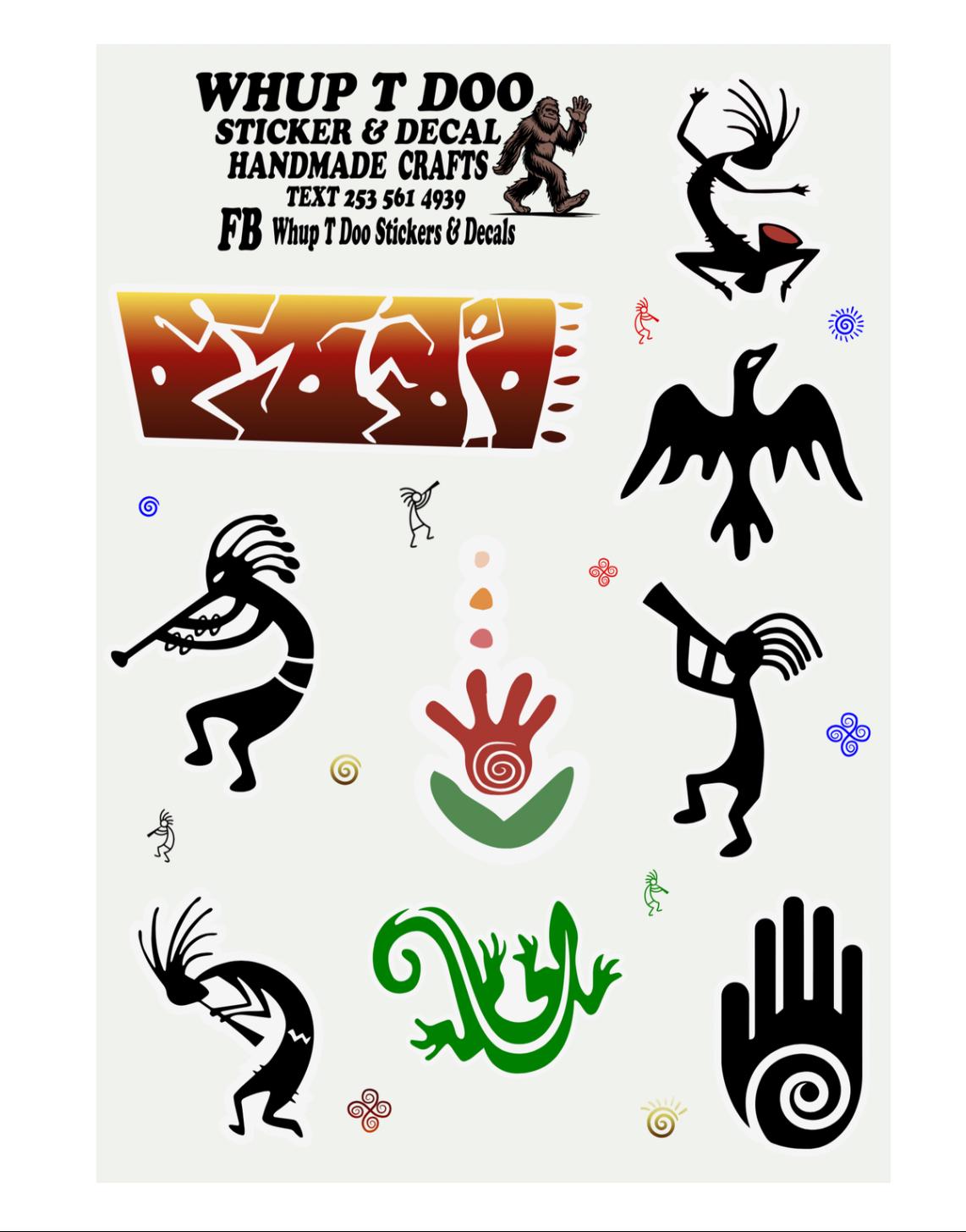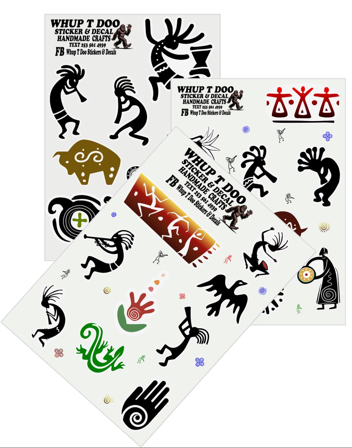 Kokopelli stickers, show your pride for Native American Heritage with these high quality sheet packs There is 4 variety to choose from Each sheet is approx 5 x 7 and stickers range from 1.2 to 2 inches and they have 7-10 stickers each.Bring these authentic art stickers to decorate cards, envelops or put on objects like water bottles, tumblers, yeti,mugs, laptop, tablets, kindles, journals, notebooks, planners, mirrors, windows, cars, bikes, golf carts, skateboards, scrapbooks or anything , notebooks, journals and use for scrapbooks, put on laptops, mirrors and windows or anything!!
