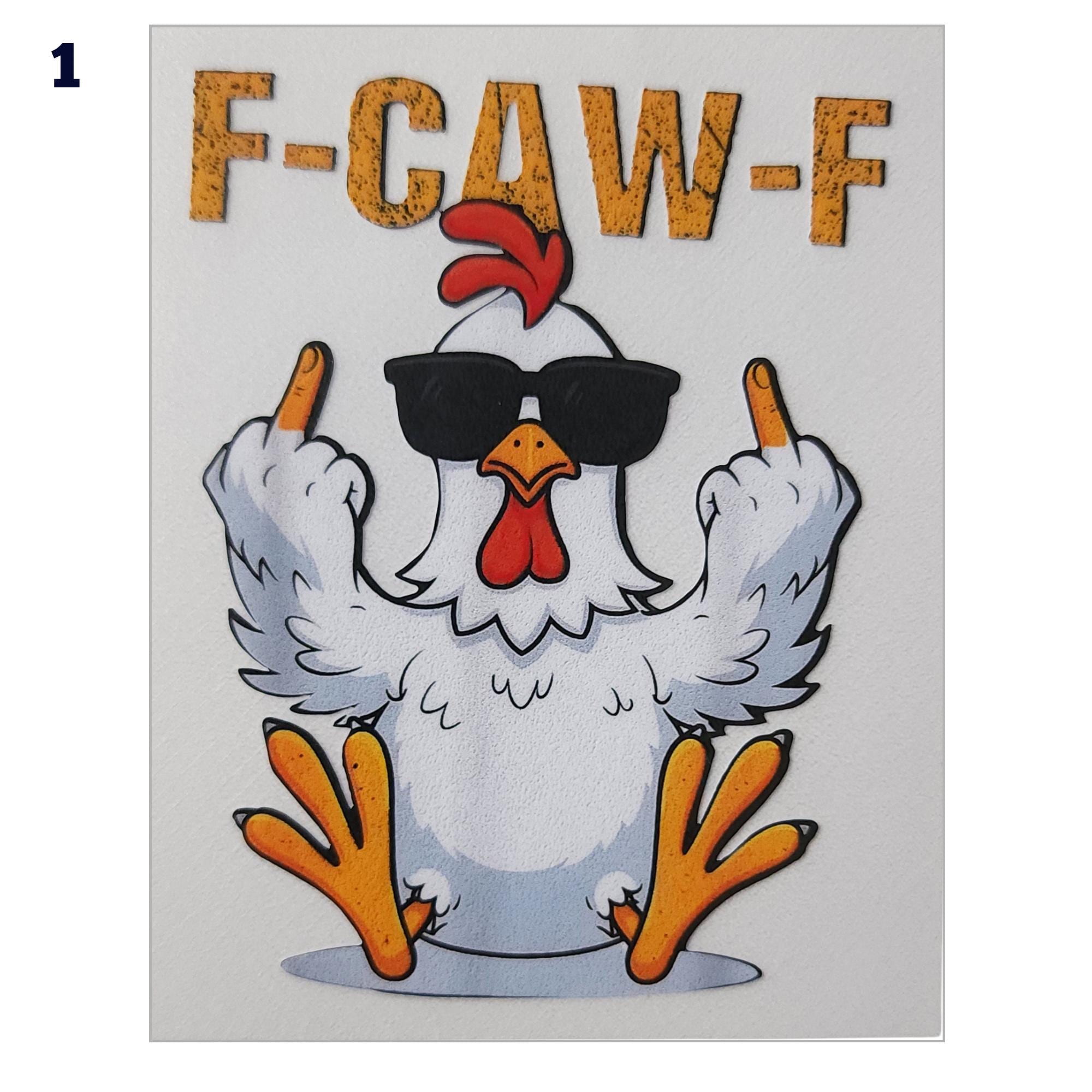 Funny chicken sticker. F caw f . Can choose from 3 To 6 inches . It is customizable, I can put a name on it . Put on a cup or a water bottle . Put on car window, mirror