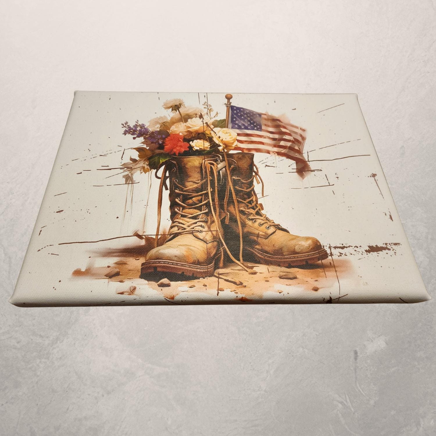 Do you have the love of patriotism this 9x12 canvas print features American flag with the combat boots of someone who has served their country. This picture is a great way to represent your American spirit for our freedom and justice. This a wood frame wrapped in canvas. You can hang or put on a shelf to display.